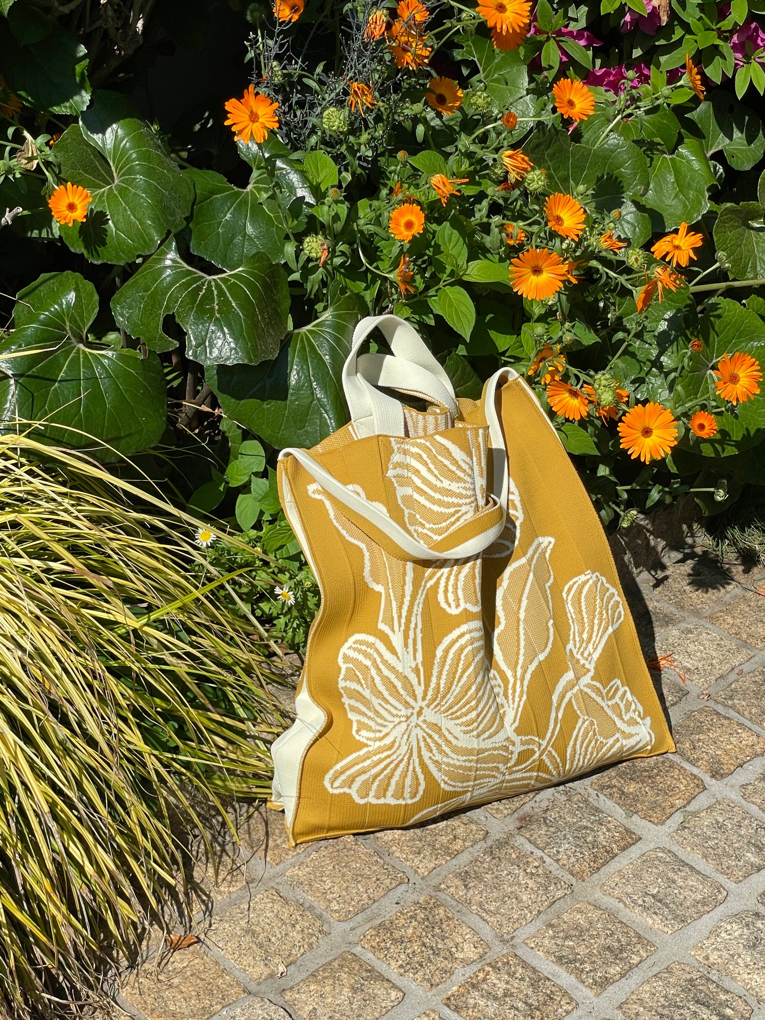 ホールガーメントという生地の無駄が出ない方法で製造されるニットバッグです。